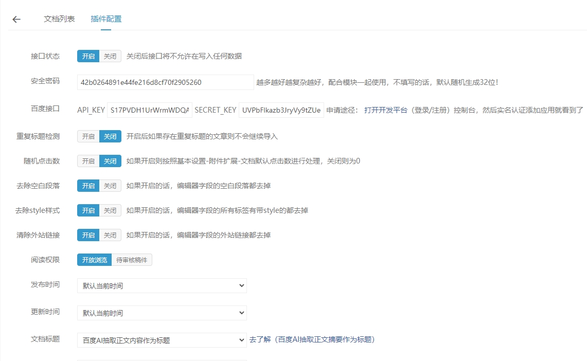 - 重复标题检测:开启以后已存在的标题不在入库,关闭后可重复发布