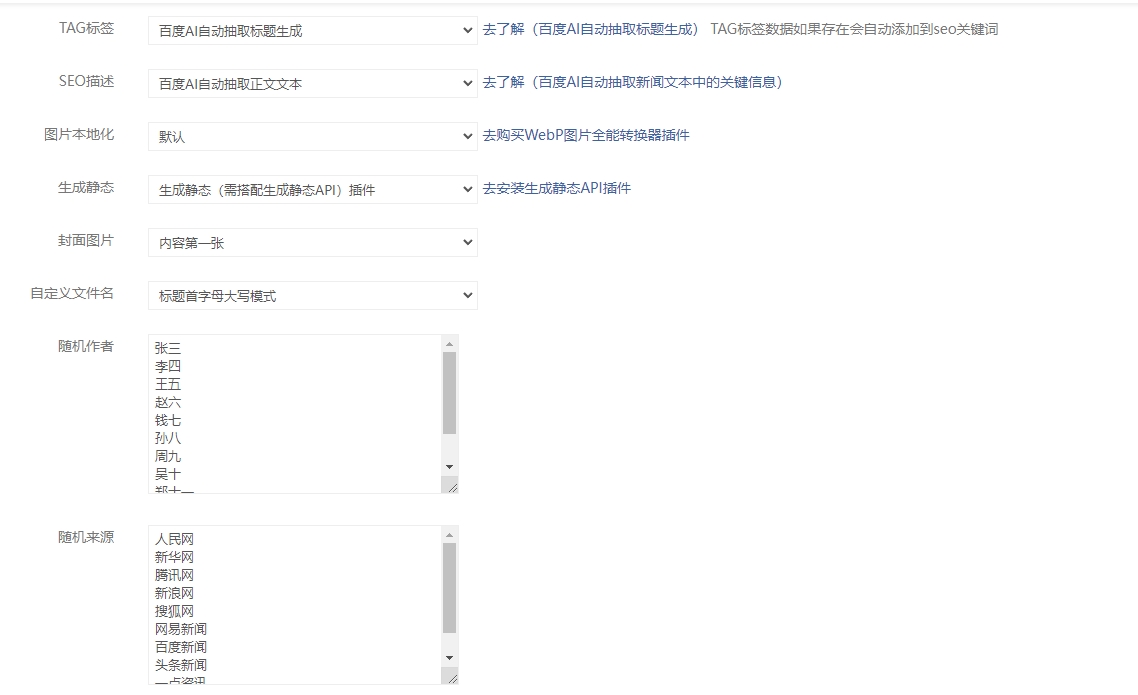- 百度接口:填写以后可使用AI来对(标题,描述,关键词,TAG标签)进行处理